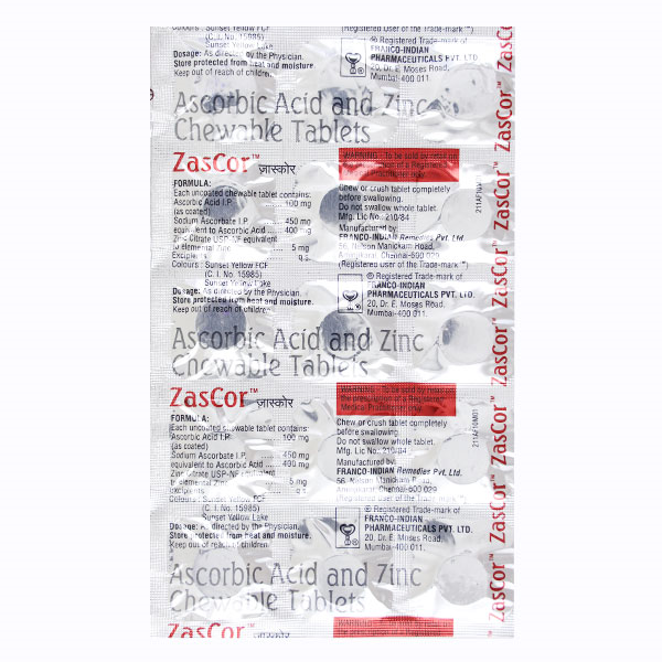 Zascor Chewable Tablet Lemon & Honey Sugar Free is a supplement of vitamin C (ascorbic acid) that restores the nutritional deficiency of vitamin C in the body and improves overall health. It is used if your diet does not provide enough vitamin C as well as to treat certain conditions caused due to vitamin C deficiency in the body.